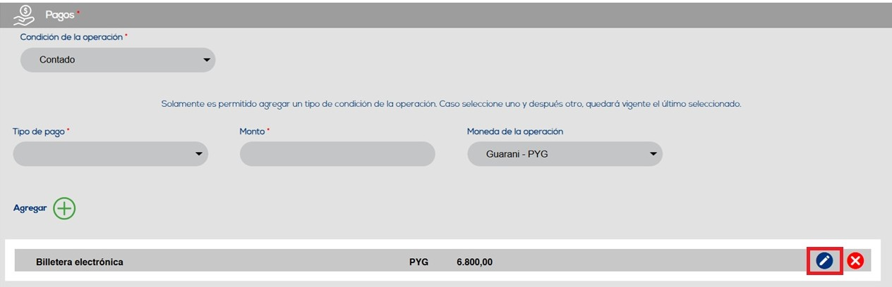 Al hacer clic en la opción de edición (ícono de lápiz), ubicada a la izquierda de la opción de eliminación (“X”) en la fila del pago agregado, será posible modificar cualquier información del pago.