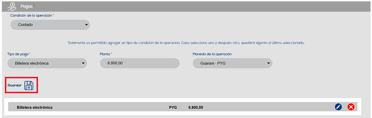 Al seleccionar la opción “Contado”, el sistema liberará los campos a llenar que son: “Tipo de pago” que tendrá diferentes opciones a seleccionar como “Billetera Electrónica”, “Cheque” entre otros, “Monto” y “Moneda de la operación”. Dependiendo del tipo de pago informado, el sistema presentará nuevos campos de obligado cumplimiento referentes a la opción seleccionada. Después de completar estos campos, el usuario deberá seleccionar la opción "Agregar" para incluir el pago en el documento: