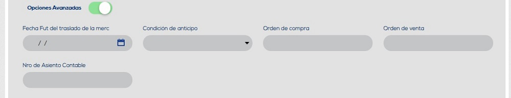 En Opciones Avanzadas, el usuario deberá hacer clic en el botón para agregar las opciones y así completar opcionalmente la siguiente información, “Fecha Fut del traslado de la merc”, “Condición de anticipo”, “Orden de compra”, “Orden de venta”, “Nro de Asiento Contable”, como muestra el imagen a continuación: