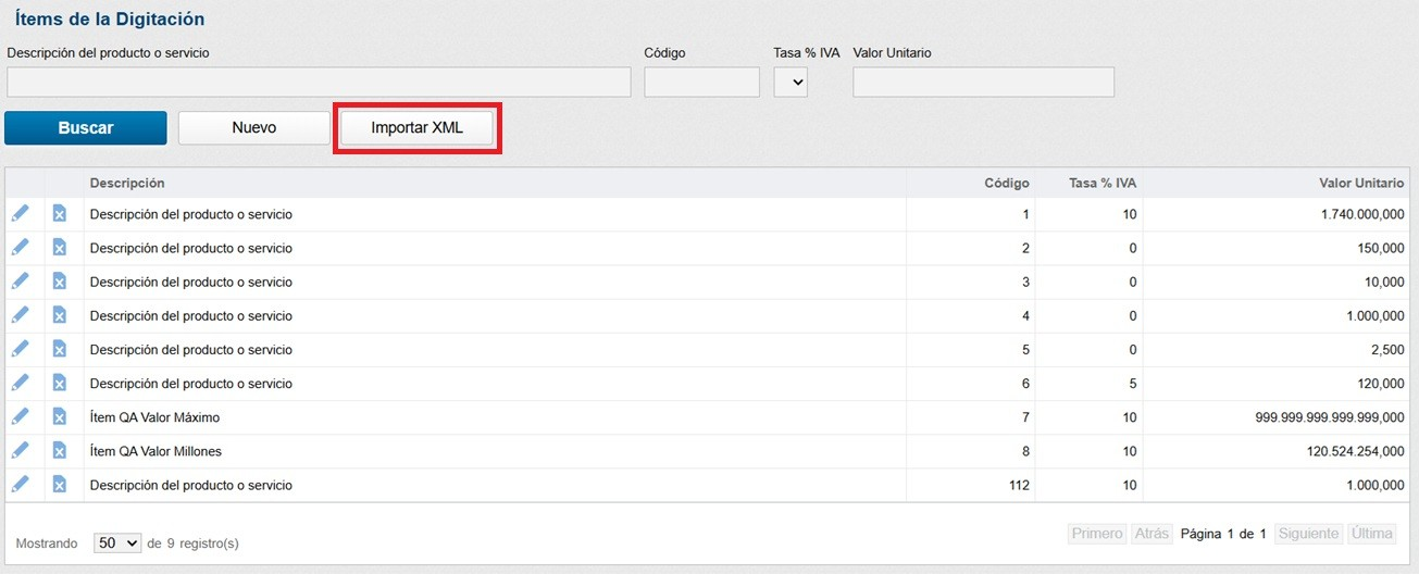 El mismo procedimiento debe seguirse para la importación de ítems. Para ello, será necesario acceder a la pantalla “Ítems de la Digitación” y hacer clic en la opción “Importar XML”, también ubicada al lado derecho del botón “Nuevo”.