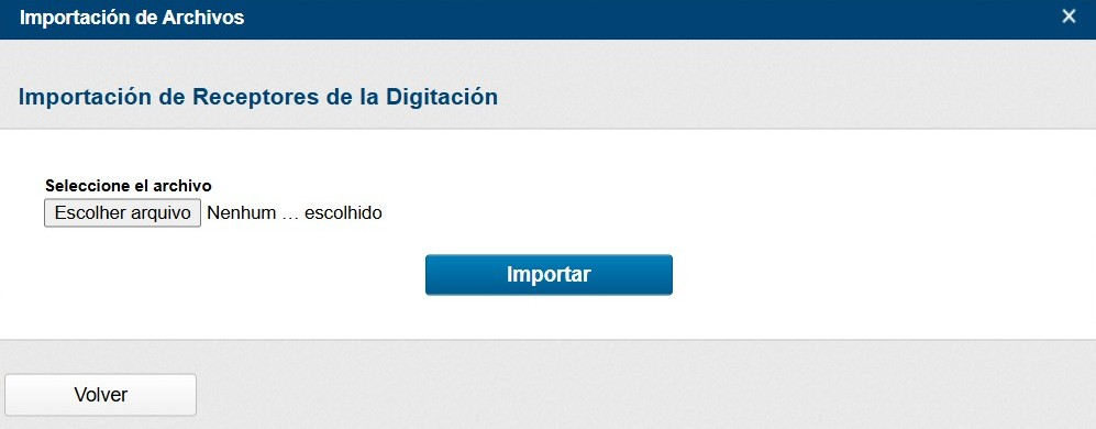 Al seleccionar esta opción, se mostrará un popup que permite elegir el archivo XML que se desea importar. Si desea consultar un ejemplo de archivo XML para la importación de receptores, haga clic aquí.